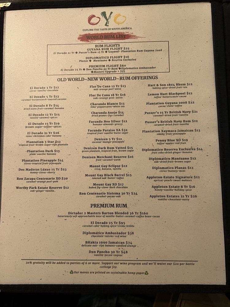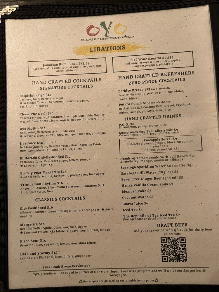 Introducing the menu at Oyo Restaurant and Jive Bar, located in Pleasanton, CA, where Caribbean and Latin American flavors come together in a unique dining experience. The tapas selection includes favorites like Beef Patties and Calypso Ceviche, while the soup and salad options feature dishes like Grilled Octopus Salad and Pureed Pumpkin Soup. Seafood lovers can indulge in Island Salmon and Run Down Fish, both bursting with tropical flavors. The restaurant's diverse menu caters to various dietary preferences with options like Pescatarian, Vegan, and many Vegetarian choices. The ambiance at Oyo is hip, casual, and trendy, making it a perfect spot for brunch, lunch, dinner, or late-night bites. With offerings like free Wi-Fi, Happy Hour Specials, and a Full Bar, Oyo Restaurant and Jive Bar ensures a memorable dining experience for all guests.